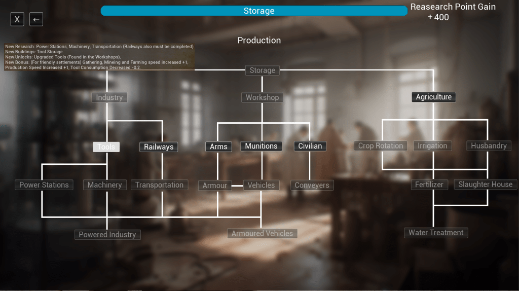 An in-depth technology tree that can unlock new weapons to use, production methods and building upgrades for the settlements. All are designed to give the player an edge in combat and economy.